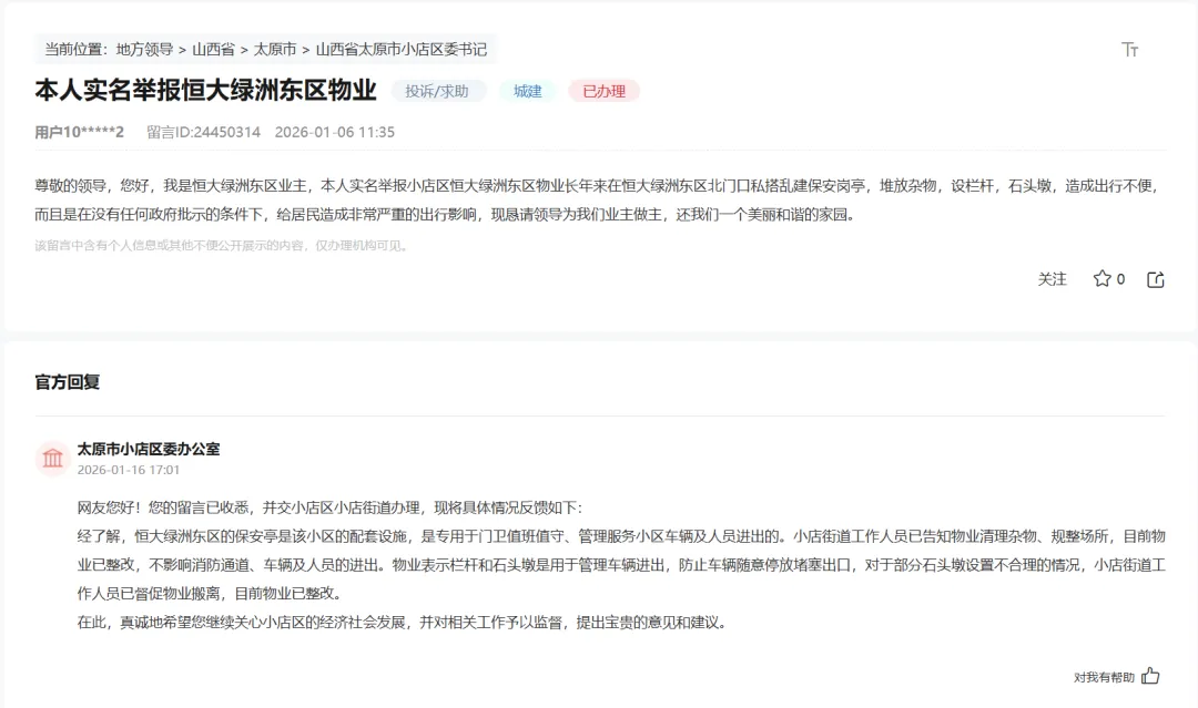 经了解,恒大绿洲东区的保安亭是该小区的配套设施,是专用于门卫值班值守、管理服务小区车辆及人员进出的。小店街道工作人员已告知物业清理杂物、规整场所,目前物业已整改,不影响消防通道、车辆及人员的进出。物业表示栏杆和石头墩是用于管理车辆进出,防止车辆随意停放堵塞出口,对于部分石头墩设置不合理的情况,小店街道工作人员已督促物业搬离,目前物业已整改。