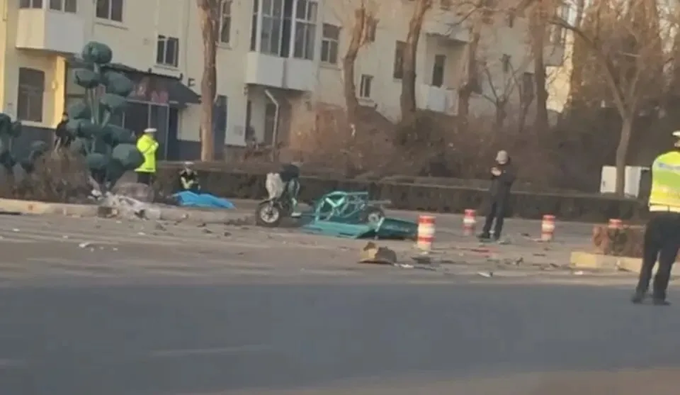 从车主发布的视频中可看到,事发位置位于该十字路口西南侧,现场停着一辆蓝色拉货三轮车,其后方车厢已严重变形。三轮车不远处地面上,铺着一块藏蓝色遗体遮盖布,布下隆起呈明显人体形状,有交警正在现场开展检查工作。