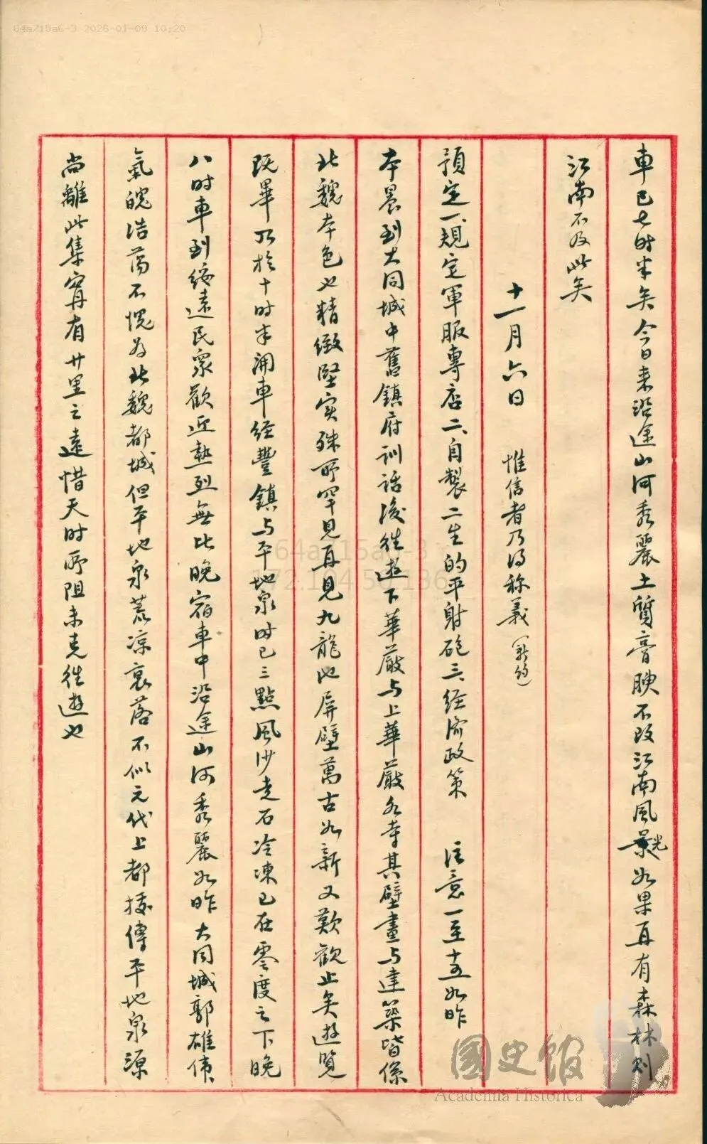 蒋在云冈石窟参观时间不长,7点半左右返回到大同城中居住,想来6点多应已出发,参观时间应在1个半小时左右,回大同后,蒋介石在日记中当晚总结今天行程,写道“今日来沿途山河秀丽,土质腴映,不似江南风景,如果再有森林,则江南不及此矣。”蒋来时已经11月,沿途树木叶子多数落光,当时百姓需伐树取柴,全国各地山上多数都是光秃秃一片,自建国后各地植树造林,各地环境才有所改善。当天晚上,蒋介石还给在北平的盟兄弟黄郛及夫人写信,信中也写到绥远一带“山河秀丽,土地肥美”,可惜没有森林。