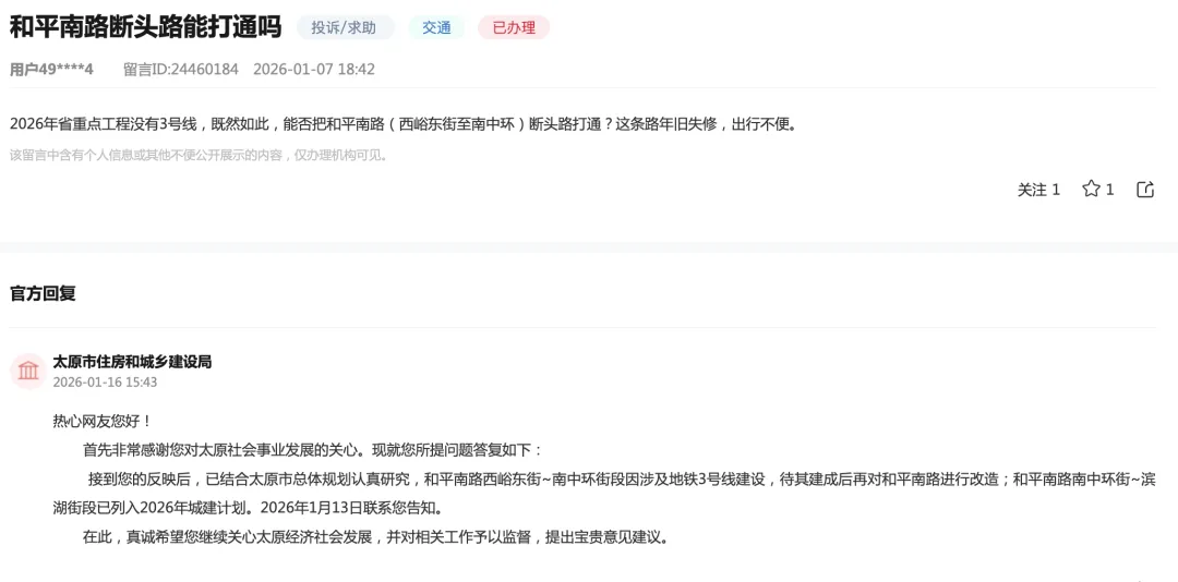 >太原一条断头路和地铁3号线,官方回复~