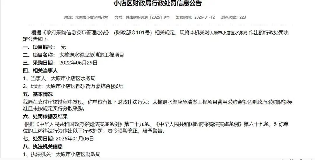 2026年1月12日,山西省政府采购官网发布行政处罚信息,太原市小店区水务局因在太榆退水渠应急清淤工程项目采购中的违法行为被处罚。
