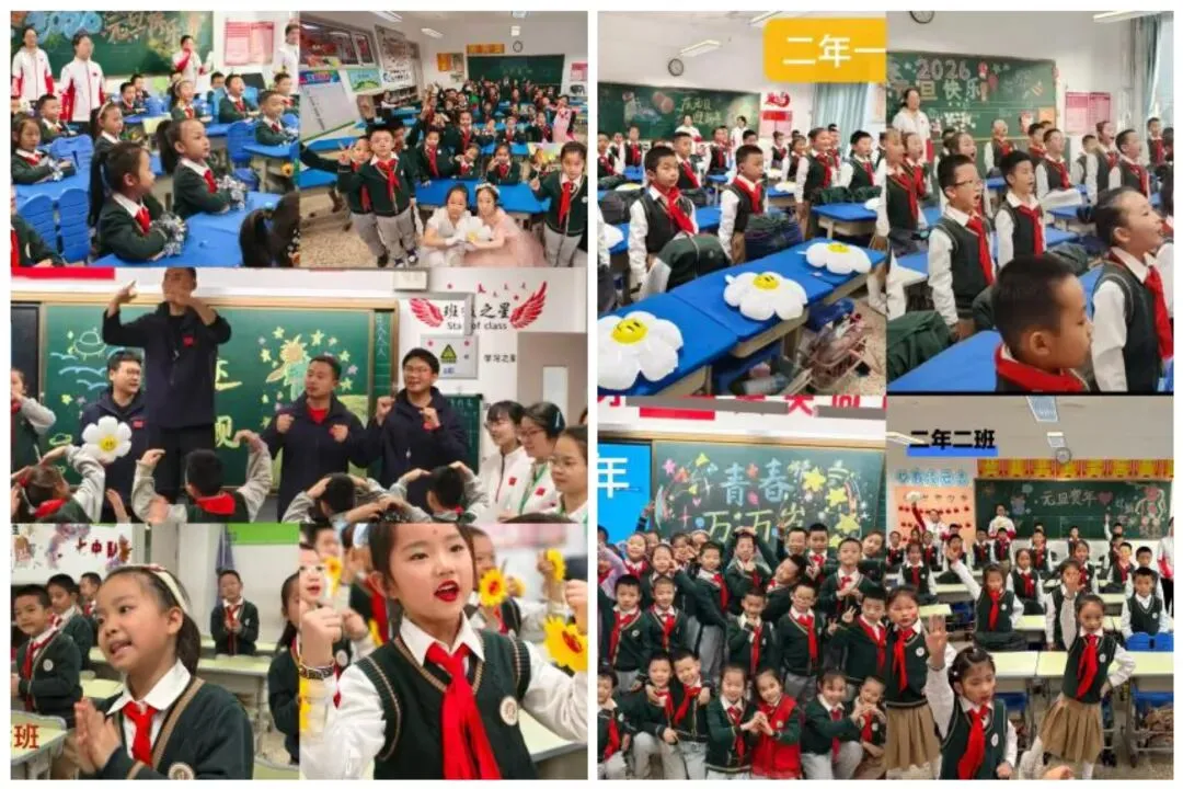 少年有梦,踏歌而行,班歌贺岁,不负新程。三年级教室化作歌声的海洋,一场充满童趣与活力的班歌演唱活动热烈上演。孩子们以稚嫩却坚定的嗓音,唱响属于自己的班级旋律,用歌声迎接新年的到来。本次班歌比赛中,四年级全体同学以《把未来点亮》为曲目精彩亮相。同学们着装整齐,精神饱满,歌声清亮悠扬,节奏铿锵有力,将对未来的憧憬与期许融入每一句歌词中。舞台上,大家的动作整齐划一,眼神坚定自信,展现出积极向上、团结奋进的班级风貌。五年级各班学子以《奇迹再现》为班歌,用铿锵有力的童声唱响少年意气,整齐的队形、坚定的眼神,将“相信光、追寻光”的信念融入每一句歌词。