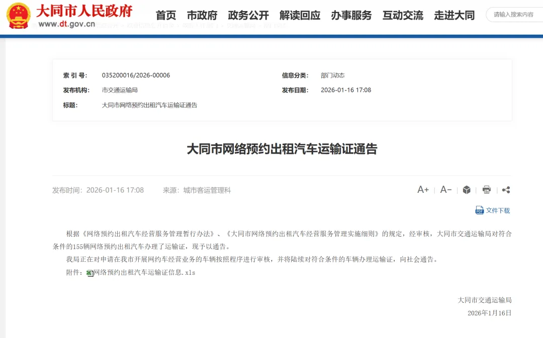 根据《网络预约出租汽车经营服务管理暂行办法》、《大同市网络预约出租汽车经营服务管理实施细则》的规定,经审核,大同市交通运输局对符合条件的155辆网络预约出租汽车办理了运输证,现予以通告。
