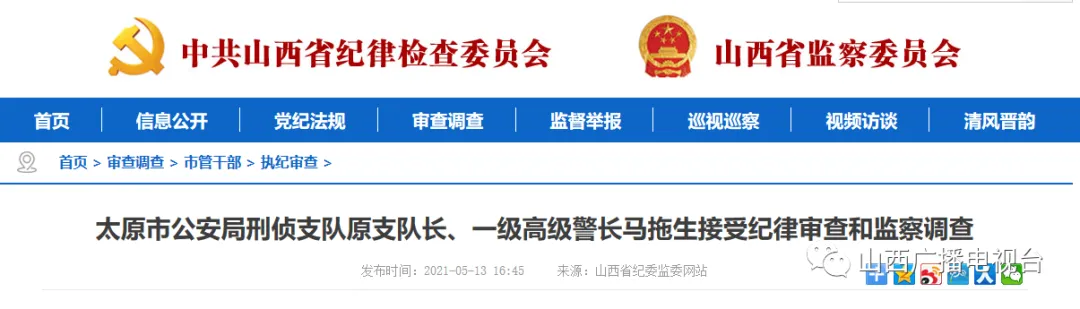太原市公安局刑侦支队原支队长、一级高级警长马拖生涉嫌严重违纪违法,目前正接受太原市纪委监委纪律审查和监察调查。