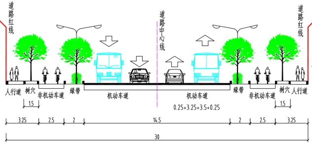 标准横断面:中间14.5米机动车道,两侧各2米绿化分隔带,2.5米非机动车道,3.25米人行道(含树穴带)。