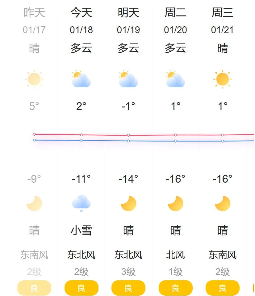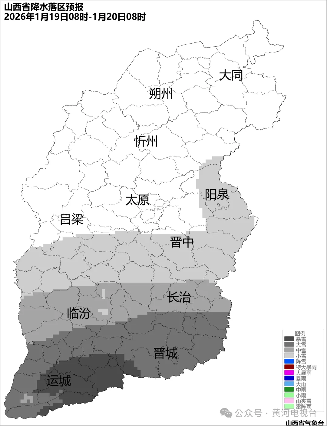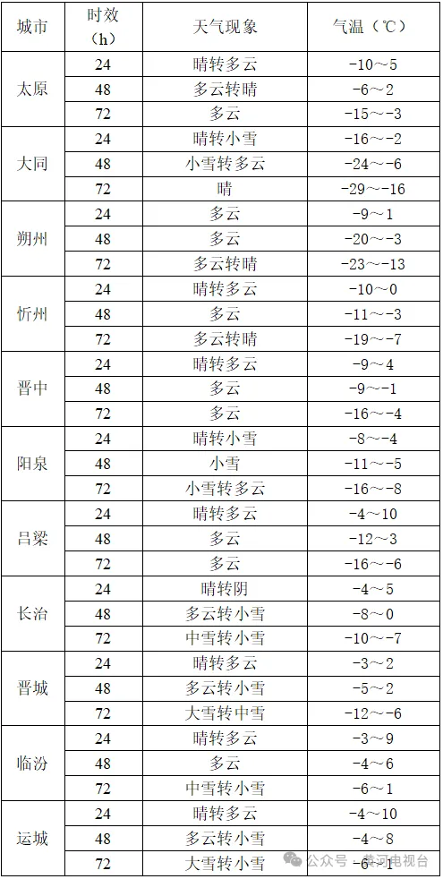 明天白天到夜间:全省阴天,中部部分和南部有小到中雪,南部部分地区有大雪,运城、晋城等地的局部地区有暴雪;气温继续下降。最高气温:北部及中南部山区-16~-7℃,中南部其余地区-6~2℃;最低气温:北部及中南部山区-29~-16℃,中南部其余地区-15~-6℃。