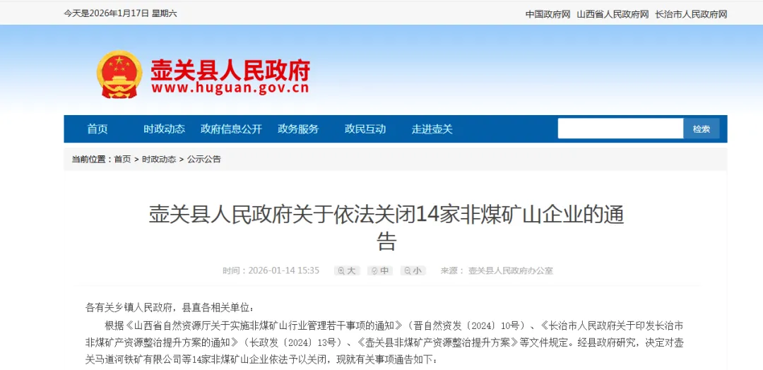 根据《山西省自然资源厅关于实施非煤矿山行业管理若干事项的通知》《长治市人民政府关于印发长治市非煤矿产资源整治提升方案的通知》《壶关县非煤矿产资源整治提升方案》等文件规定。经县政府研究,决定对壶关马道河铁矿有限公司等14家非煤矿山企业依法予以关闭,现就有关事项通告如下: