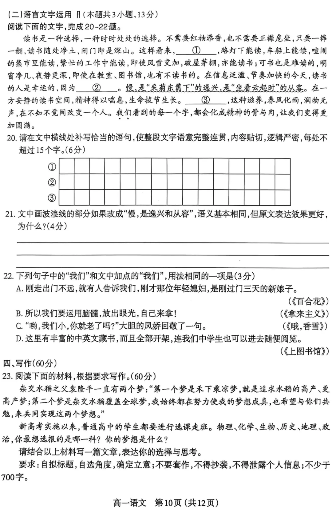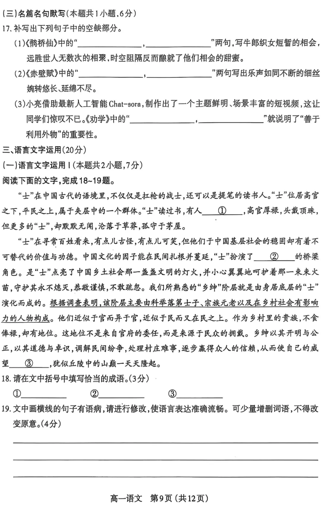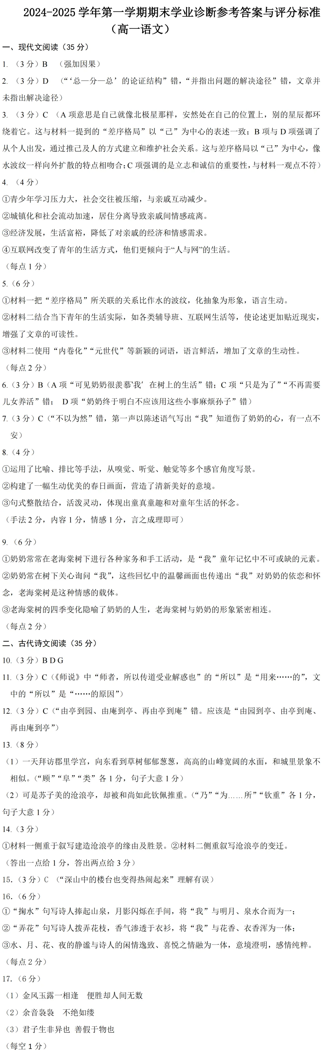 >太原市 高一 2024-2025 第一学期 期末【语文】试卷+答案