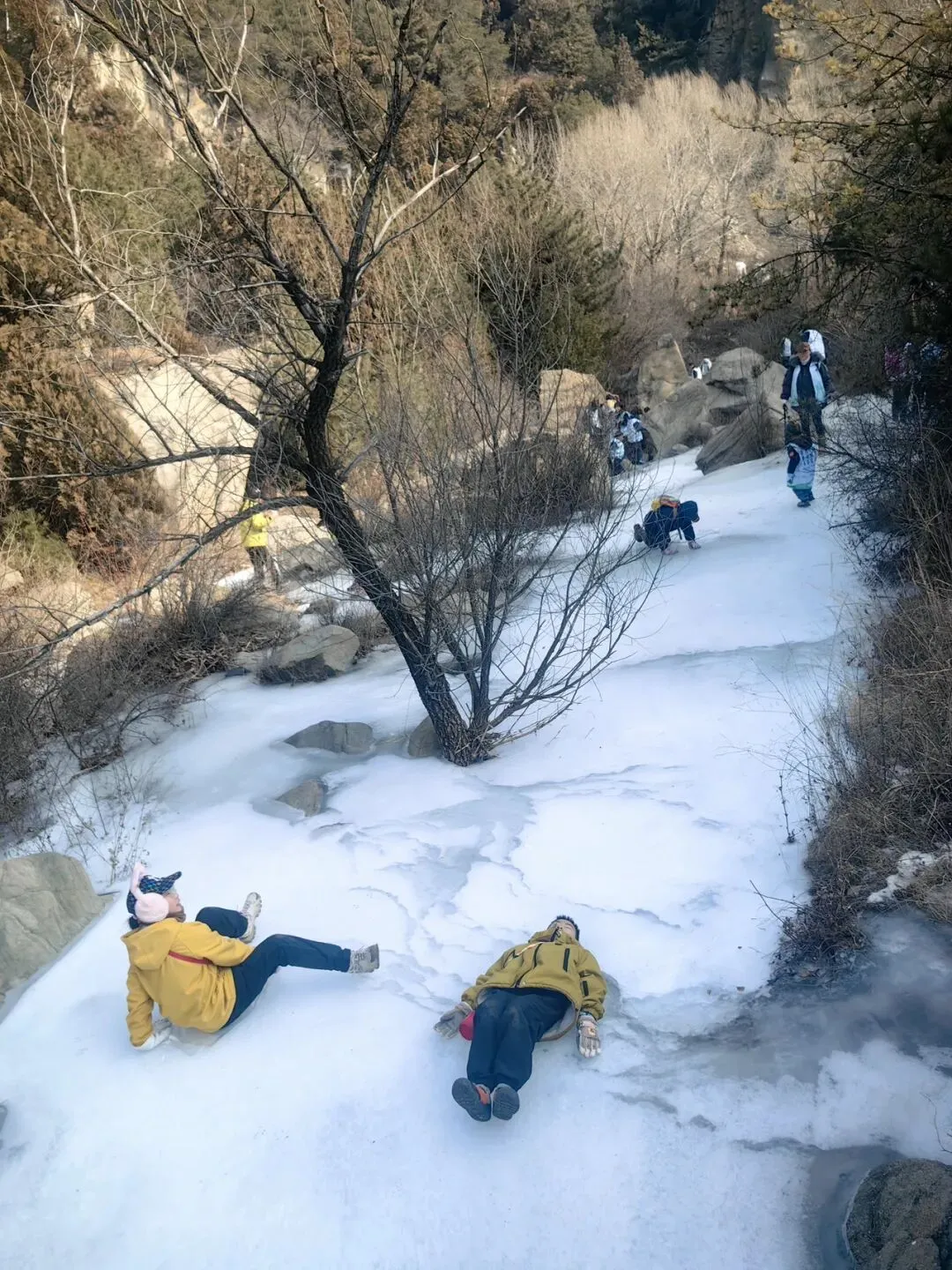 换上冰爪踩上冰面的瞬间,身体不受控制地打滑,引来一阵哄笑。胆大的孩子早已蹲下身,像小企鹅一样顺着冰坡“出溜”而下;稳重些的则拉着同伴的手,一步一挪地感受着冰面的光滑。几百米的天然冰道被无数人滑出了光泽,坐在冰上顺势而下时,风从耳边呼啸而过,失重的刺激与稳稳落地的安心交织,让孩子们乐此不疲地一次次爬起、滑下。