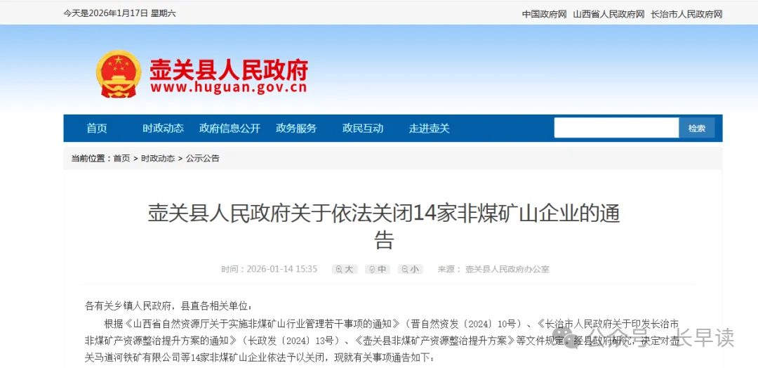 根据《山西省自然资源厅关于实施非煤矿山行业管理若干事项的通知》《长治市人民政府关于印发长治市非煤矿产资源整治提升方案的通知》《壶关县非煤矿产资源整治提升方案》等文件规定。经县政府研究,决定对壶关马道河铁矿有限公司等14家非煤矿山企业依法予以关闭,现就有关事项通告如下: