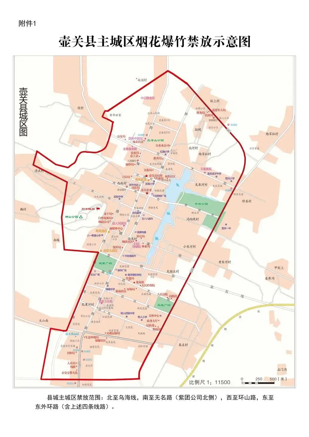 1、县城主城区禁放范围:北至乌海线,南至无名路(紫团公司北侧),西至环山路,东至东外环路(含上述四条线路)。