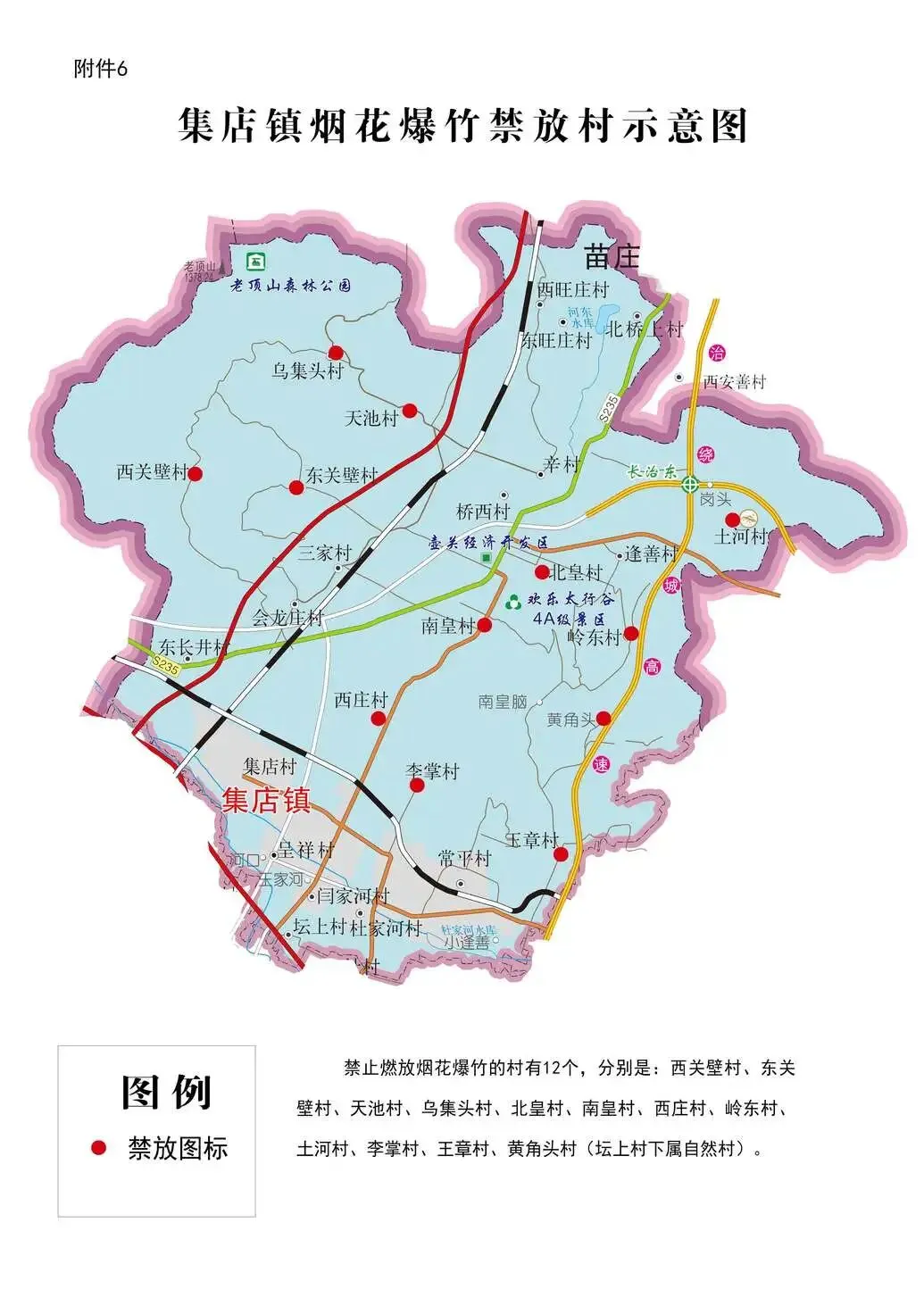 集店镇禁放范围:西关壁村、东关壁村、天池村、乌集头村、北皇村、南皇村、西庄村、岭东村、土河村、李掌村、王章村、黄角头村(坛上村下属自然村)。