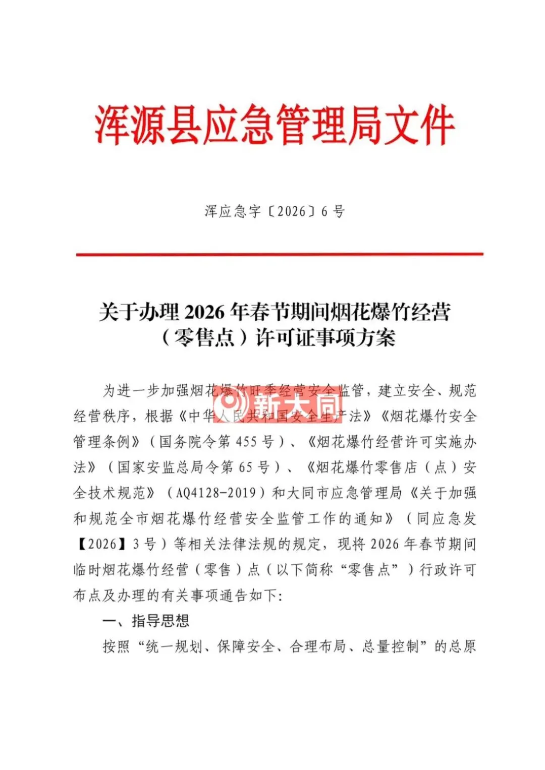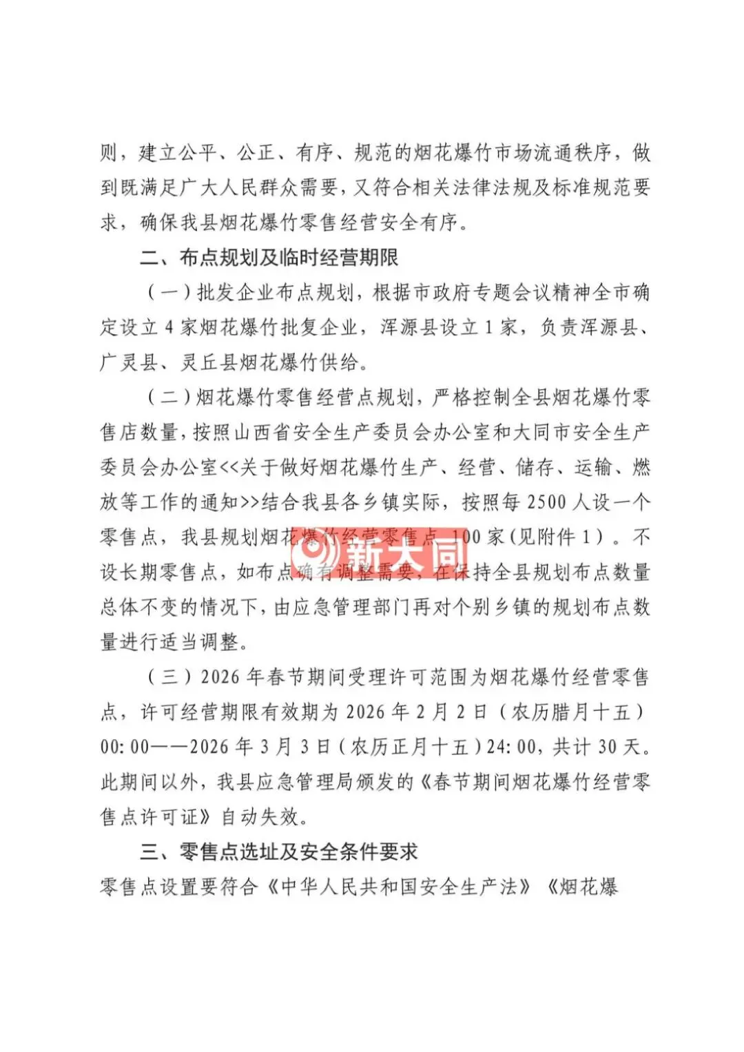 依据《中华人民共和国安全生产法》《烟花爆竹安全管理条例》(国务院令第455号)、《烟花爆竹经营许可实施办法》(应急管理部令第13号)、《山西省安全生产委员会办公室关于做好烟花爆竹生产、经营、储存、运输、燃放等工作的通知》(晋安办发〔2025〕89号)、《山西省应急管理厅关于做好全省烟花爆竹经营安全监督管理工作的通知》(晋应急发〔2025〕312号)、《大同市安全生产委员会办公室关于做好烟花爆竹生产、经营、储存、运输、燃放等工作的意见》(同安办发〔2025〕72号)、《大同市应急管理局关于加强和规范全区烟花爆竹经营安全监管工作的通知》(同应急发〔2026〕3号)文件精神,结合我区实际情况,现就全区烟花爆竹经营(零售)许可证办理工作有关事宜通告如下: