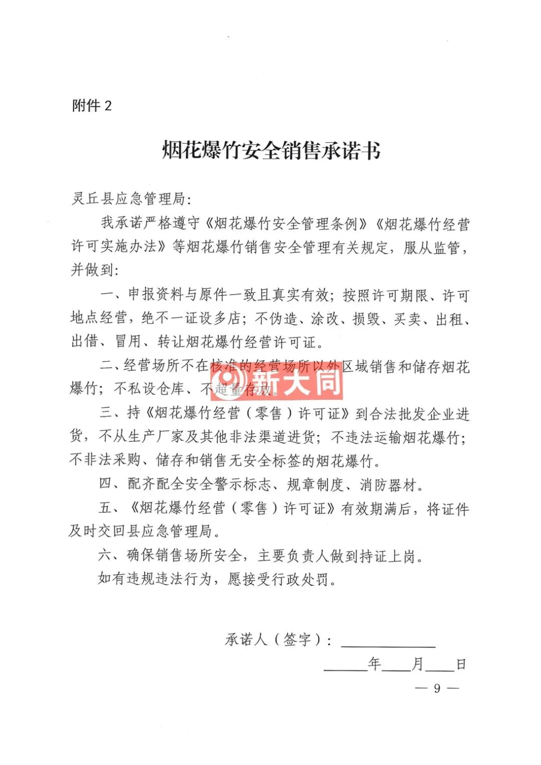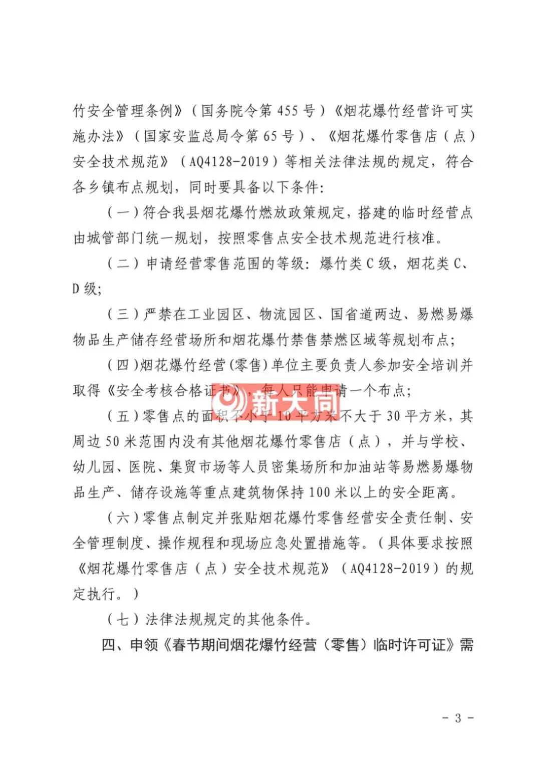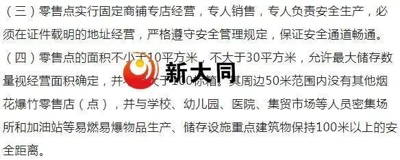 为进一步加强烟花爆竹经营安全监管,规范市场秩序,根据《中华人民共和国安全生产法》、《烟花爆竹安全管理条例》(国务院令第455号)、《烟花爆竹经营许可实施办法》(国家安监总局令第65号)、《山西省应急管理厅关于做好烟花爆竹经营安全监督管理工作的通知》(晋应急发〔2025〕312号)、《大同市安全生产委员会办公室关于做好烟花爆竹生产、经营、储存、运输、燃放等工作的意见》(同安办发〔2025〕72号)、《烟花爆竹零售店(点)安全技术规范》(AQ4128-2019)等相关法律法规、行业标准规定,现将有关事项通告如下: