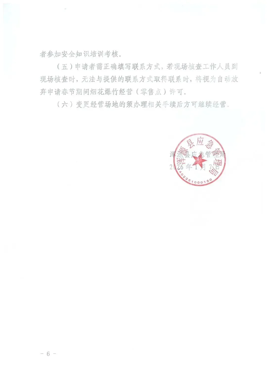 (四)申请者需正确填写联系方式,若现场核查工作人员到现场核查时,无法与提供的联系方式取得联系时,将视为自动放弃申请春节期间烟花爆竹经营(零售)临时许可。