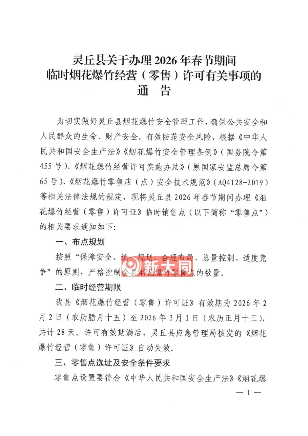 为进一步加强烟花爆竹销售的管理,建立安全、规范的经营秩序,根据《中华人民共和国安全生产法》《烟花爆竹安全管理条例》(国务院令第455号)、《烟花爆竹经营许可实施办法》(国家安监总局令第65号)、《烟花爆竹零售店(点)安全技术规范》(AQ4128-2019)等相关法律法规的规定,现将天镇县2026年春节期间办理临时烟花爆竹经营(零售)点(以下简称“零售点”)的相关要求通知如下: