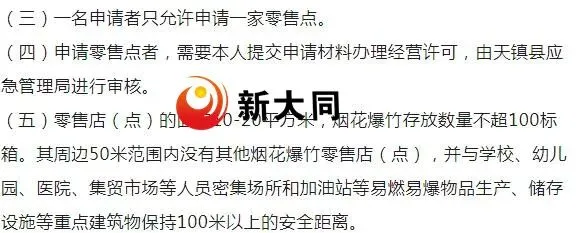 (一)烟花爆竹零售点经营者须严格遵守相关法律法规,规范经营行为、强化安全管理并及时排查消除各类安全事故隐患。经营货物须从大同云州区兆丰烟花有限公司等当地合法批发企业采购,进货量遵从批发企业管理规定(5000元为基点),存量严格控制在核定限额内;严禁私设库房、另设存放点,严禁采购销售非法渠道流入的烟花爆竹(私炮)。