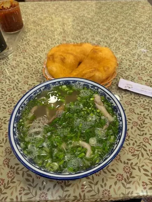 第2样,羊杂汤,大同人的早饭标配。5块钱一碗不带主食,加2块钱给你切一堆羊杂,肚丝、肺片、血块、肠子,堆得冒尖。汤是乳白色的,飘着一层红油辣子,撒一把香菜葱花。大冬天早晨7点,零下20度,当地人蹲在街边端着碗往嘴里倒,喝的满头大汗,胃里熨帖的很。第一次喝可能觉得膻,喝惯了就上隐,隔两天不喝浑身难受。