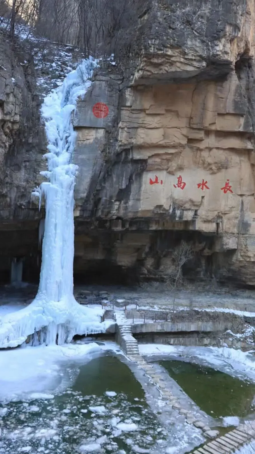 沿着峡谷越走越远,越走越深。一路上冰挂层叠、峡谷间的流水清澈、山脚下的小潭翠的深邃。 山高水长,崖边的刻字生动诠释此刻之景。潺潺流水从高耸山峰飞瀑而下,水汽四散宛若修仙圣地。