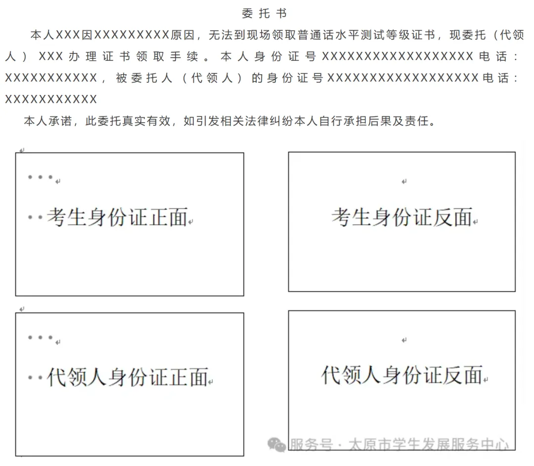2.由代领人领取,须提供考生本人委托书(后附样书)和代领人身份证原件。为了确保测试人员证书安全,如没有委托书和代领人身份证原件,将不予领取。