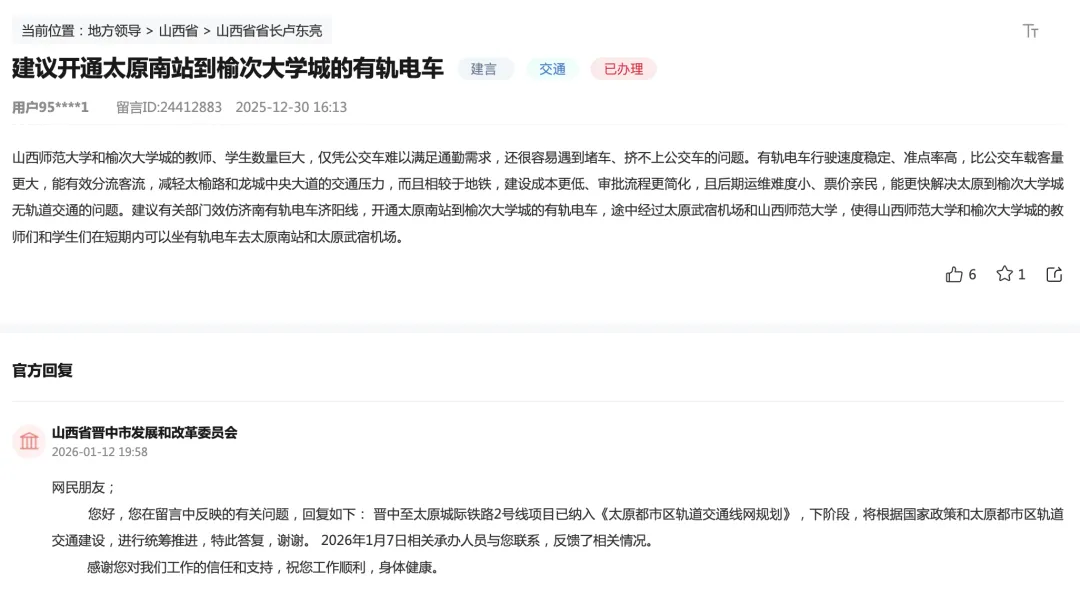 山西师范大学和榆次大学城的教师、学生数量巨大,仅凭公交车难以满足通勒需求,还很容易遇到堵车、挤不上公交车的问题。有轨电车行驶速度稳定、准点率高,比公交车载客量更大,能有效分流客流,减轻太愉路和龙城中央大道的交通压力,而且相皎于地铁,建设成本更低,审批流程更简化,且后期运维难度小票价亲民,能更快解决太质到愉次大学城无轨道交通的问题。建议有关部门效仿济南有轨电车济阳线,开通太原南站到愉次大学城的有轨电车,途中经过太原武信机场和山西师范大学,使得山西师范大学和榆次大学城的教师们和学生们在短期内可以坐有轨电车去太原南站和太原武宿机场。