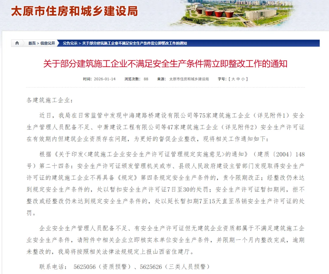 >太原这122家建筑公司注意!安全生产不达标,1个月内必须整改!否则重罚!