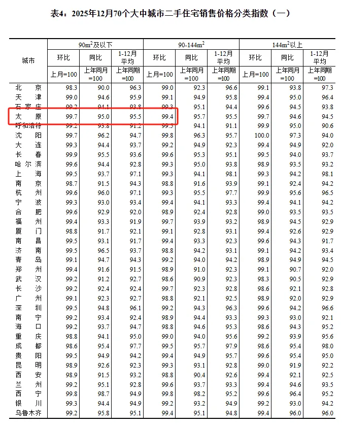 所有面积段环比、同比、全年平均均下跌,中端面积(90-144㎡)环比跌幅更大,反映二手市场各面积段需求普遍不足,价格承压明显。