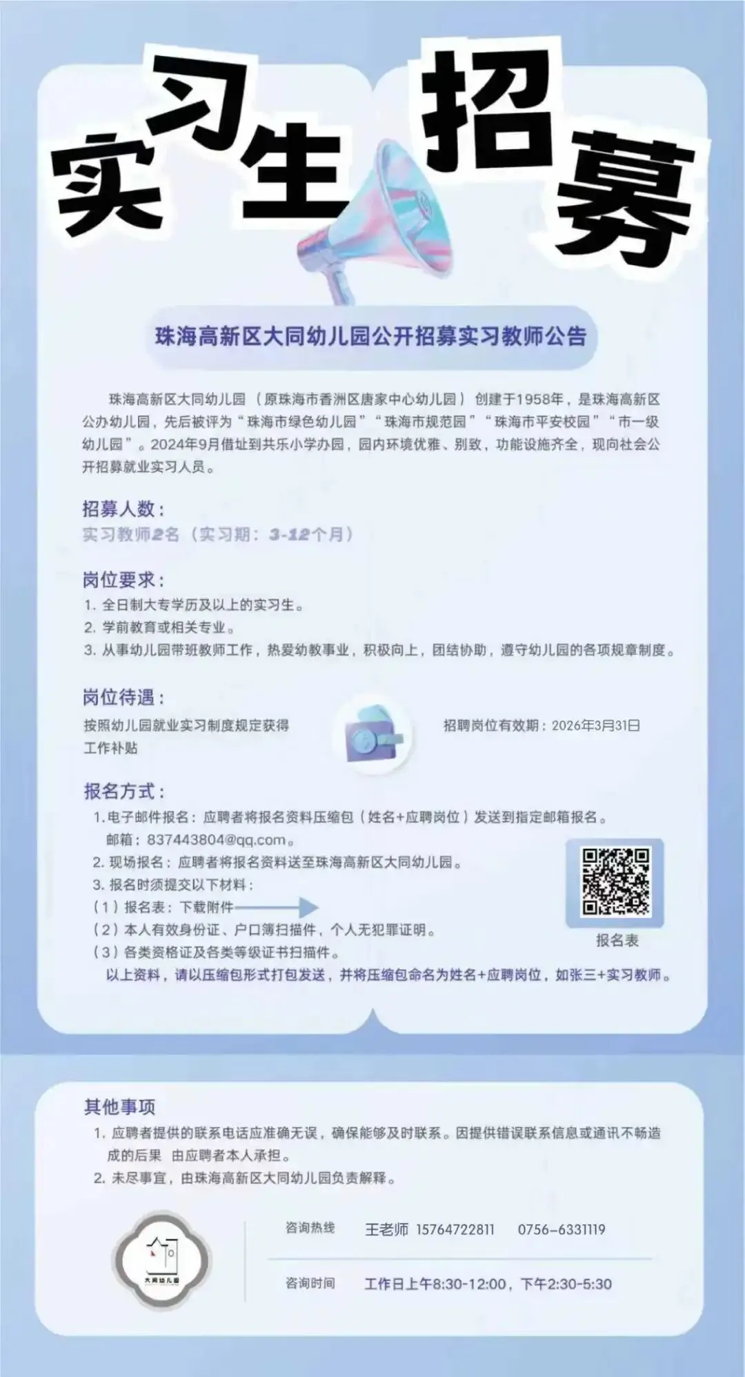 >【大同•通知】珠海高新区大同幼儿园公开招聘实习教师公告