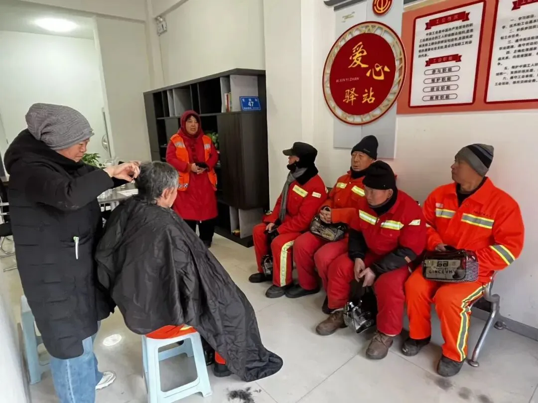 天胜雅园工会驿站内暖意融融,刚结束早班清扫的环卫工人们围坐在一起,搓着手唠着家常。工作人员将打包好的洗漱包依次递到大家手中,驿站一角的理发区更是热闹,理发师手中的剪刀上下翻飞,不一会儿就为几位环卫工人修剪出清爽利落的发型,一位老师傅摸着新剪的头发笑着说:“这下干活都更精神了!”