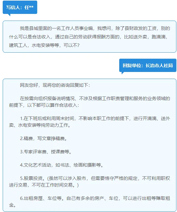 长治编制内人员能不能搞兼职?“市长信箱”回复!