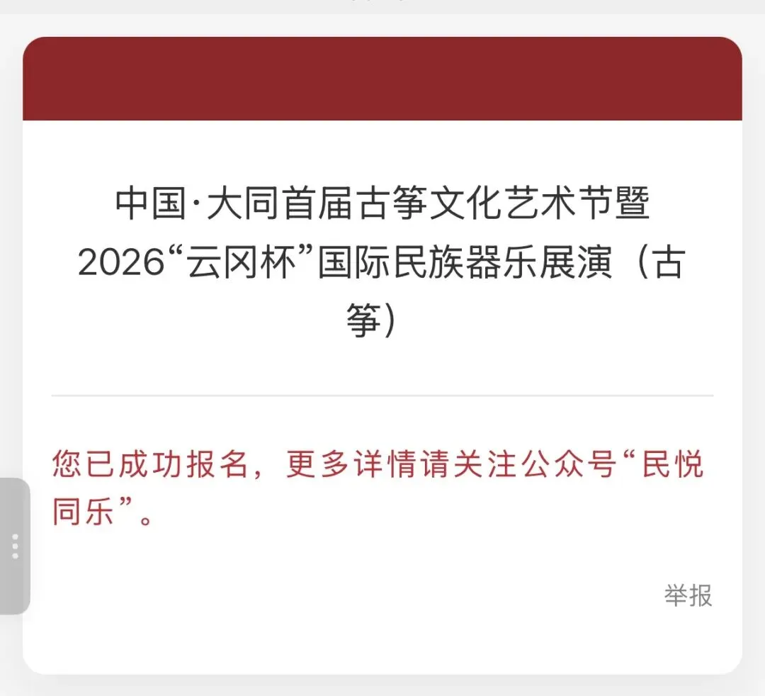 为深入贯彻落实国家关于推动文化繁荣、建设文化强国的战略部署,积极响应“推动中华优秀传统文化创造性转化、创新性发展”的时代号召,中国·大同首届古筝文化艺术节暨2026“云冈杯”国际民族器乐展演(古筝)活动于2026年1月正式启动。
