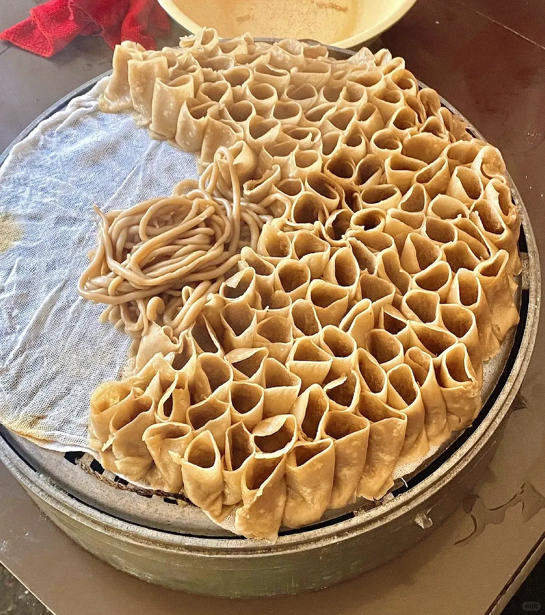 莜面栲栳栳做法速写:这菜讲究手劲。开水烫面,趁热揉光。揪一小块,在光滑的石板上用手掌一推一卷,瞬间成个圆筒状,立在笼屉里,挨挨挤挤摆满一圈。大火蒸熟,出锅时热气带着莜麦香扑鼻而来。吃的时候,一定要浇上滚烫的臊子,让汤汁灌满每一个孔洞,一口下去,满嘴留香。
