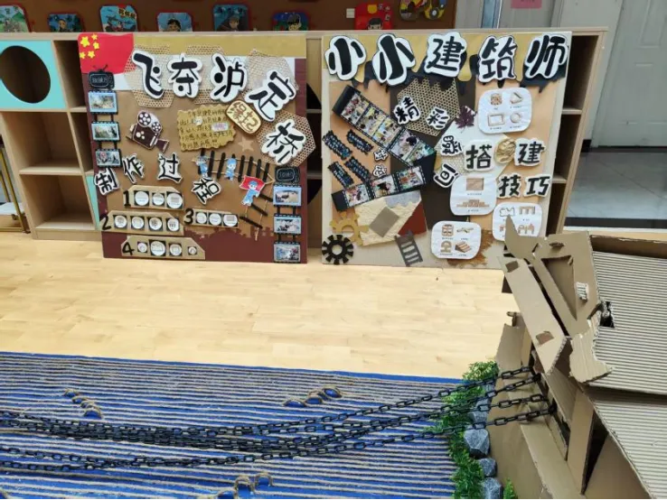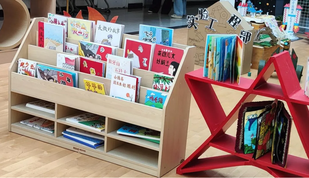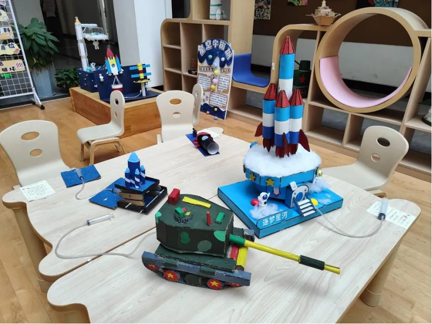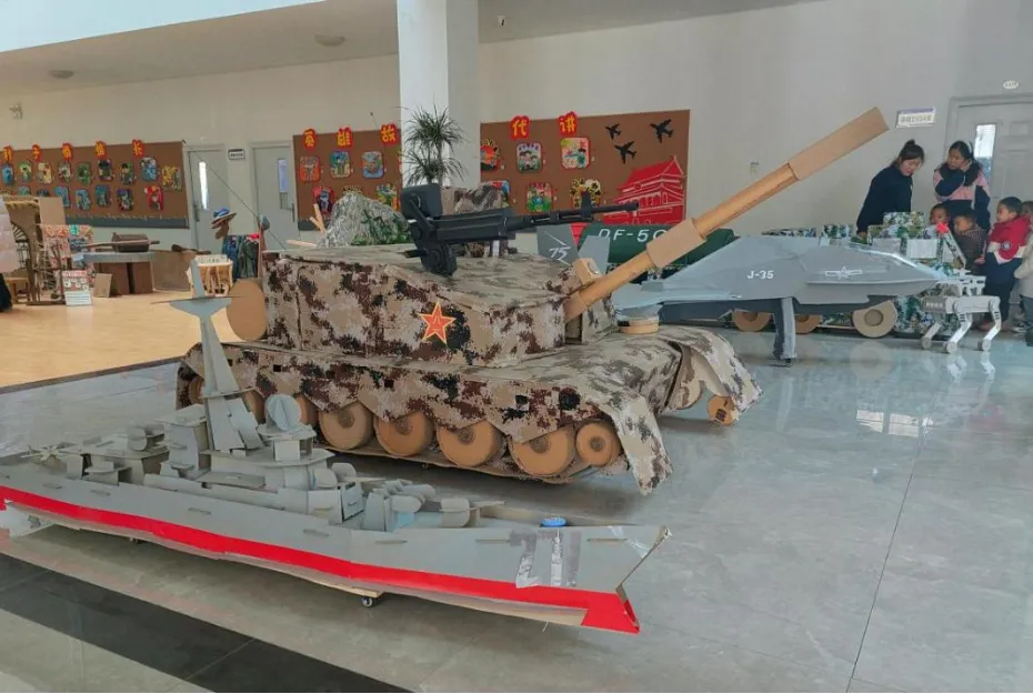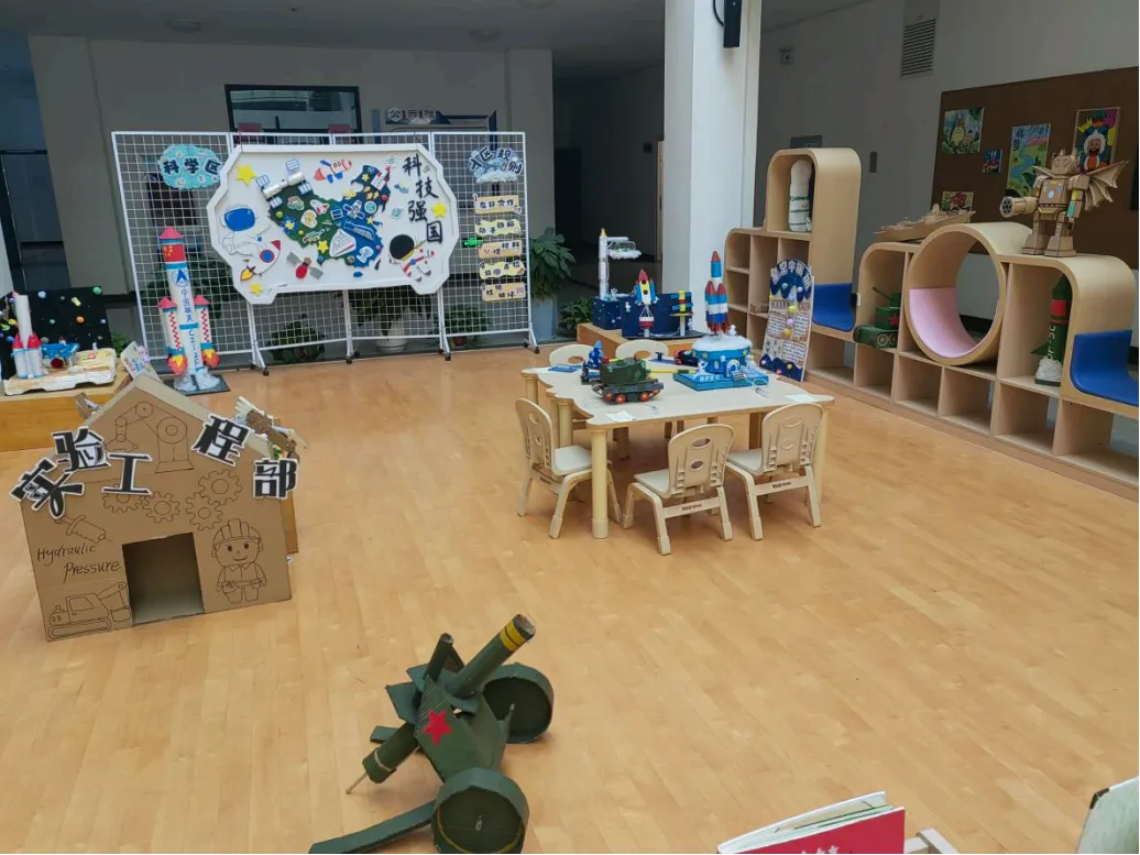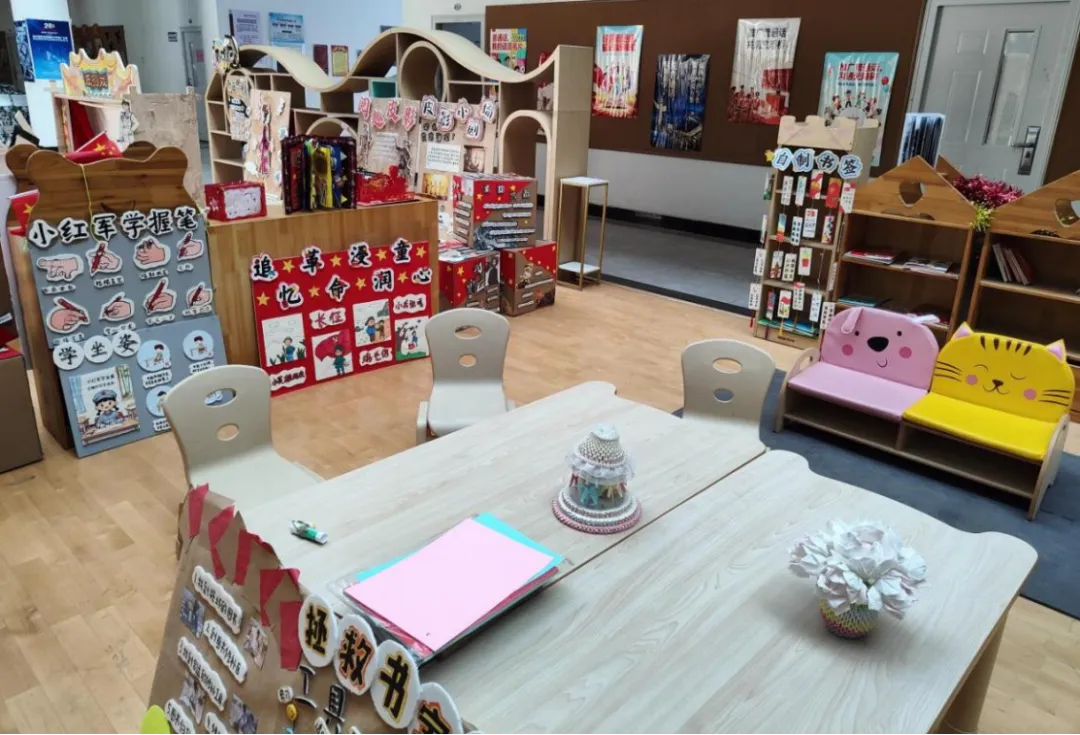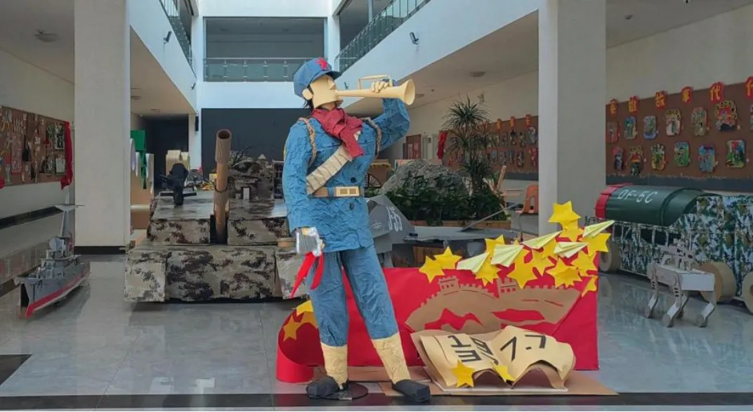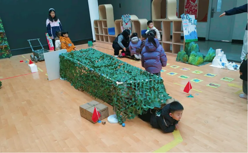 南泥湾劳动体验区里,孩子们化身“小小劳动者”,体验耕耘、收获的乐趣,在角色扮演中感悟“独立自主、艰苦奋斗”的南泥湾精神,让红色品格在劳作实践中自然养成。以“飞夺泸定桥”为原型打造的建构区,将的历史智慧与幼儿动手能力培养相结合,在空间建构与角色创作中,重温革命先辈的生存智慧与抗争精神。体育融合区,更是将红色故事转化为体能挑战任务,孩子们跨越障碍、奋勇争先,在奔跑与协作中,将“勇敢无畏、坚韧不拔”的精神内化于心、外化于行。地道战演示区则以模型还原了抗战时期的隐蔽场景,幼儿可以沉浸式感受军民同心、以智破敌的勇气与智慧,读懂平凡中的伟大。皮影戏表演区搭建起传统文化与革命叙事的桥梁,聆听革命小故事、亲手操控皮影、演绎红色小剧本,在光影流转与角色扮演中,历史变得鲜活生动,红色种子在孩子们心中悄然萌芽。红色绘本阅读区陈列着学生们手绘的红色绘本,幼儿在图文并茂的故事里认识英雄、了解历史。柔软的阅读空间搭配生动的绘本内容,革命精神在沉浸式阅读中永续传承。科学区摒弃对武器的简单模仿,转而聚焦科技背后的自然之力,传递理性和平理念。天梭坦克、静音声波装置、升降液压火箭、气压机械臂等趣味科学道具,传达“善用科技、捍卫和平”的理念,助力幼儿树立正确的科技观与和平观。红色主题墙作为重要的教育载体,以时间为轴,以事件为线,完整讲述了1931年至1945年的革命峥嵘岁月,更延伸至1949年新中国成立后的发展历程。以绘画、手工、故事创编等多元形式让幼儿在耳濡目染中感知榜样力量,读懂今日幸福生活的来之不易,让红色记忆在潜移默化中扎根。本次展览不仅是环境创设,更是一次模块化课程资源建设的实践尝试过程。它诠释了学前教育专业如何将思政教育目标,通过具身化、游戏化的专业路径,转化为未来幼师可执行、可迁移的教育能力,为红色文化融入幼儿教育提供了扎实的实践范式。供稿:张 琦 王 琼