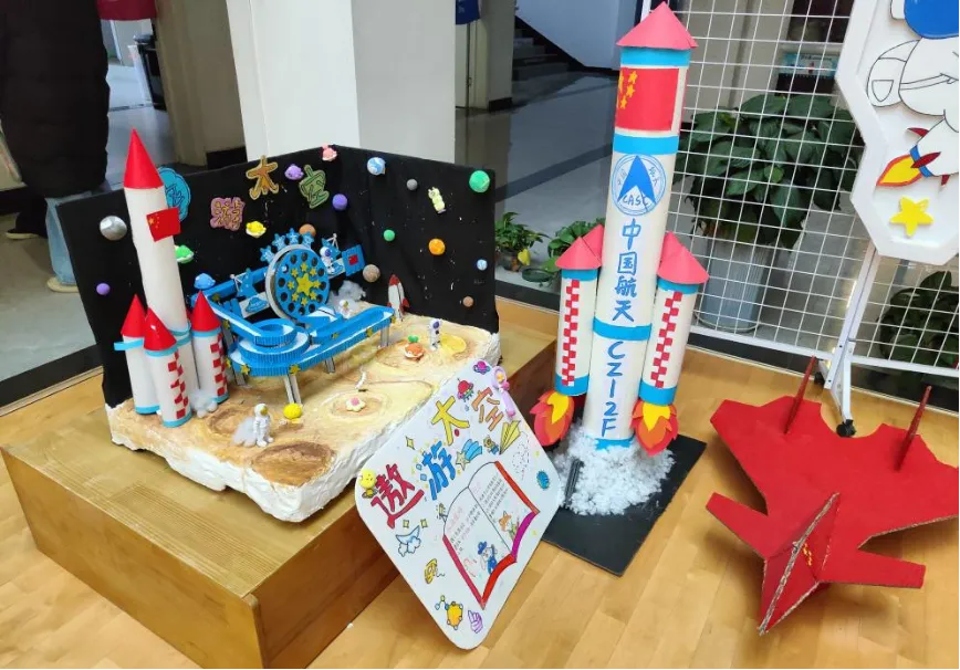 入口处由学生亲手制作的现代国防模型,线条硬朗、充满力量,与三维主题墙遥相呼应。一面是呈现当下的国防力量,一面是镌刻岁月的革命记忆,在无声的对话中串联起历史与当下,为整个活动奠定厚重而温暖的基调。