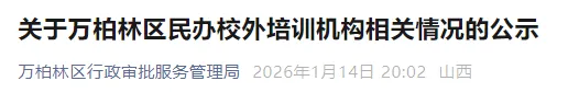 根据《中华人民共和国行政许可法》、《中华人民共和国民办教育促进法》和《中华人民共和国民办教育促进法实施条例》等法律法规的有关规定,现对太原市万柏林区近期拟新设立的民办校外培训机构情况予以公示,便于社会查询、监督。