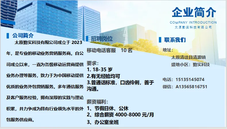 2、招聘简章电子版,包括单位名称、企业基本情况、招聘岗位、招聘人数、岗位任职要求、工资待遇、联系电话、联系人、企业地址等内容。