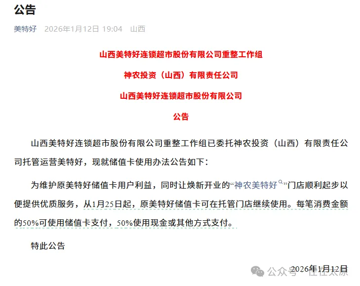 对于广大持有原美特好储值卡的消费者,新管理方制定了明确的过渡方案:自1月25日起,在“神农美特好”消费时,每笔交易金额的50%可使用原储值卡支付,其余50%需通过现金、移动支付等其他方式结算。这一方案旨在逐步消化历史负债,同时保障新店的现金流安全。