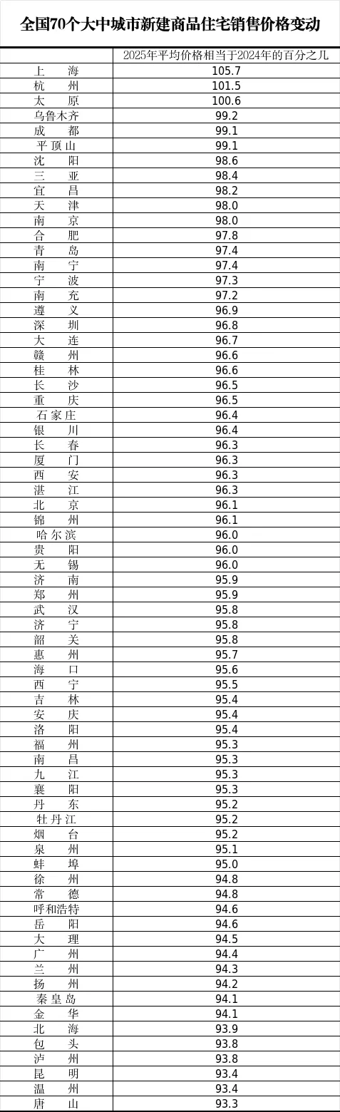 今天国家统计局发布2025年12月份70个大中城市新建商品住宅销售价格变动情况,数据显示,2025年价格与2024年相比,全国70城仅3个地区上涨。