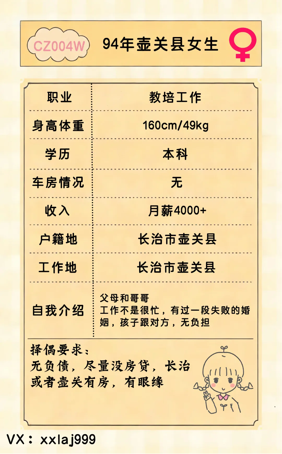 【CZ004W】94年长治市壶关县女生,从事教培工作,非常体贴的女生