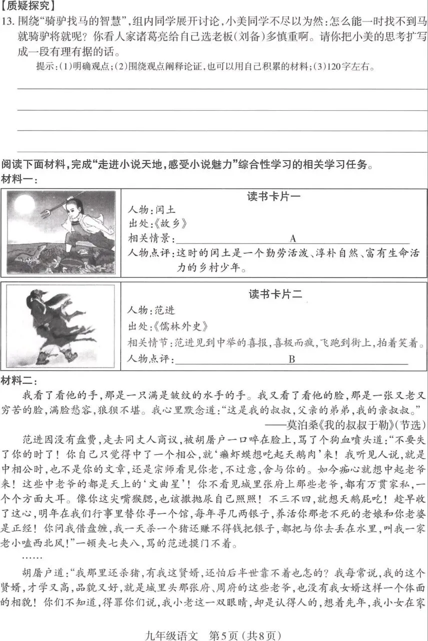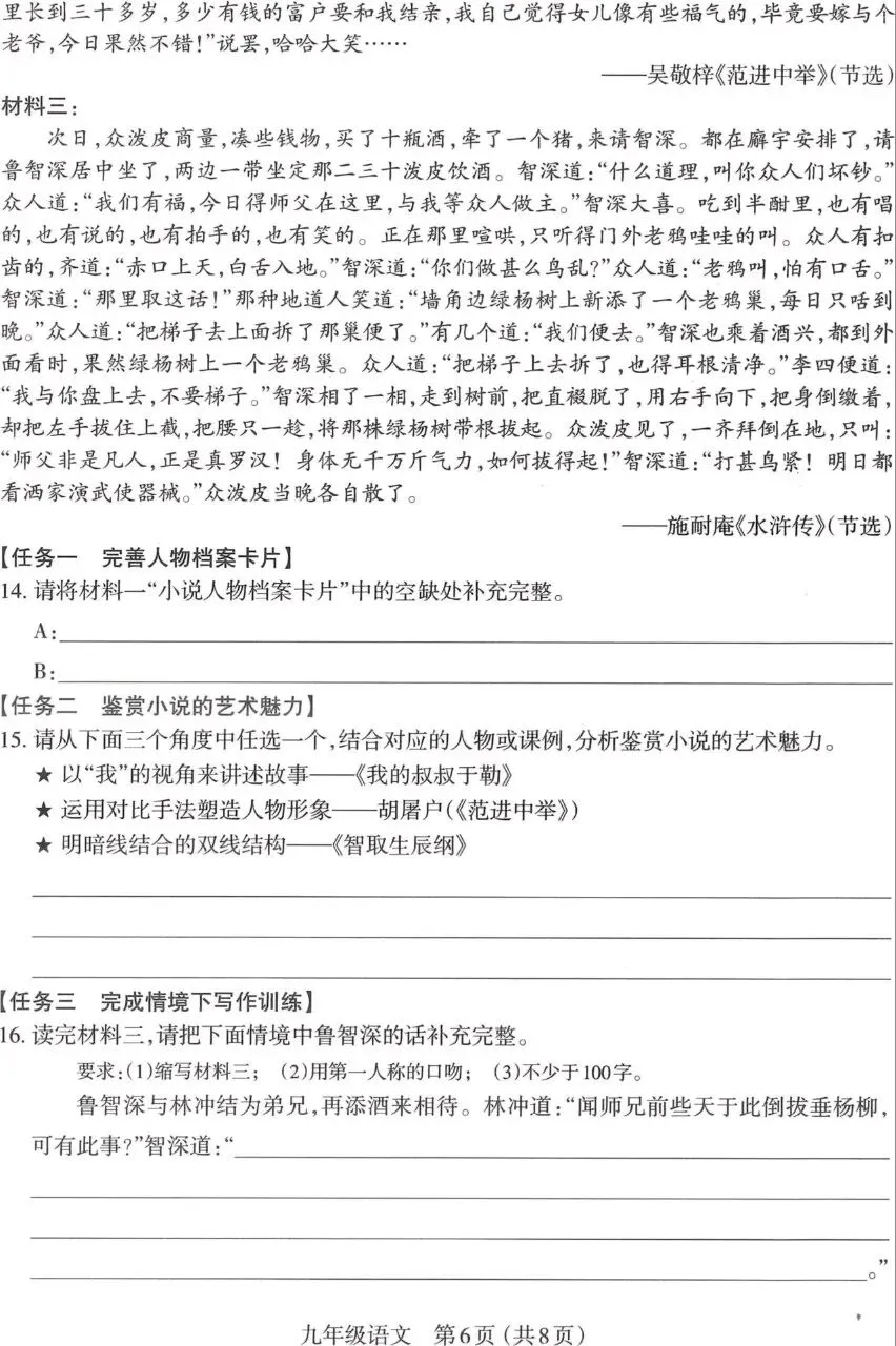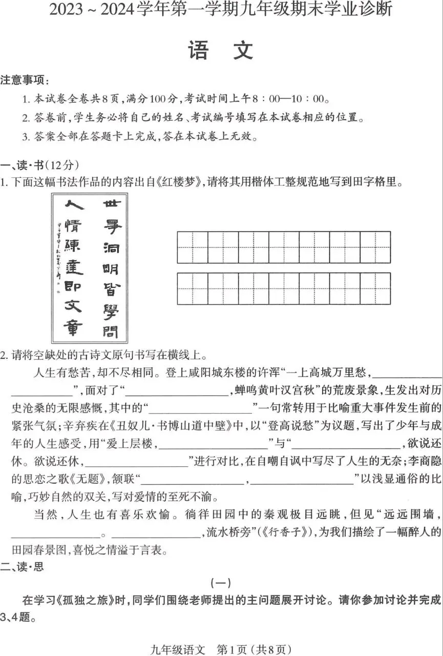 2023~2024学年第一学期九年级期末学业诊断语文试题参考答案