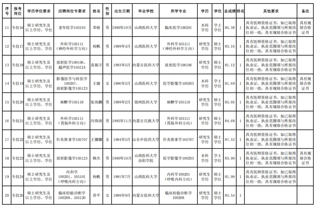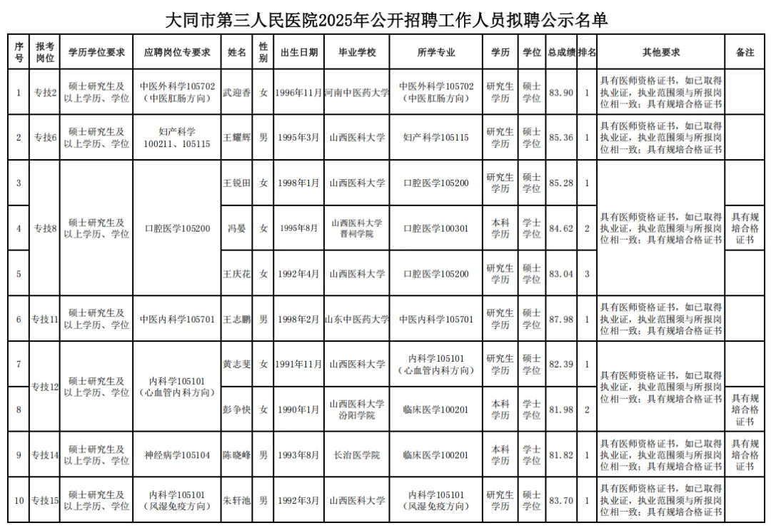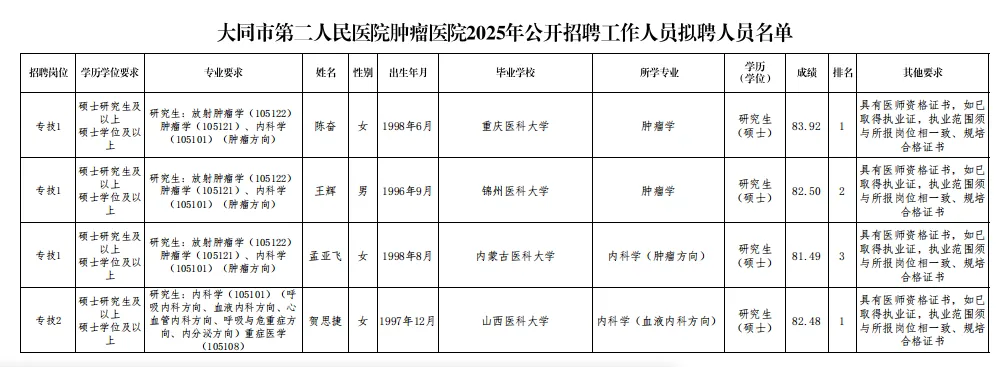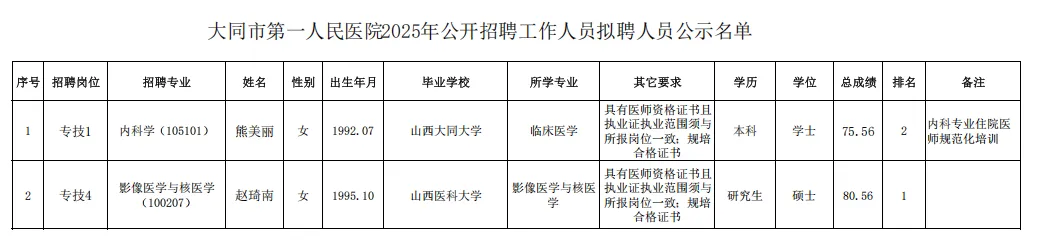 根据《大同市市直公立医院2025年公开招聘工作人员公告》,现将大同市第一人民医院2025年公开招聘工作人员拟聘人员予以公示。