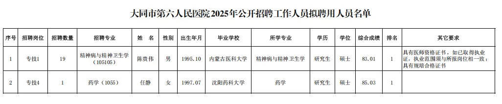 大同市第六人民医院2025年公开招聘工作人员拟聘用人员名单.pdf