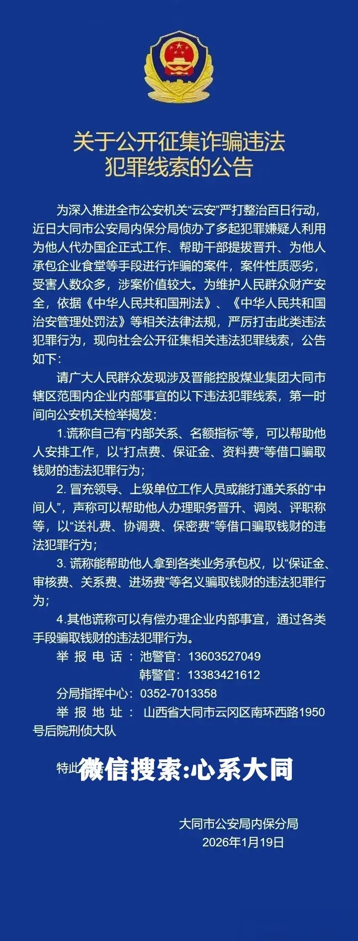 >公开征集犯罪线索!大同警方通告
