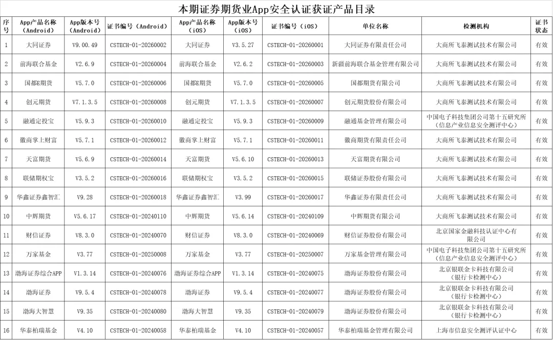 大同证券有限责任公司的“大同证券”App等9款App通过证券期货业App安全认证,符合行业标准《证券期货业移动互联网应用程序安全规范》(JR/T 0192-2020)及《证券期货业移动互联网应用程序安全检测规范》(JR/T 0240-2021)要求,获得认证证书。中辉期货有限公司的“中辉期货”App等7款App通过认证监督审查,符合行业标准《证券期货业移动互联网应用程序安全规范》(JR/T 0192-2020)及《证券期货业移动互联网应用程序安全检测规范》(JR/T 0240-2021)要求,其认证证书持续有效。