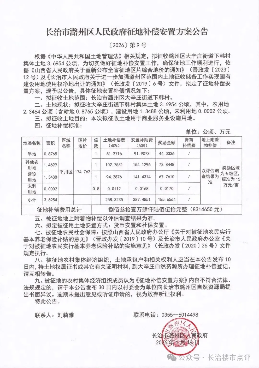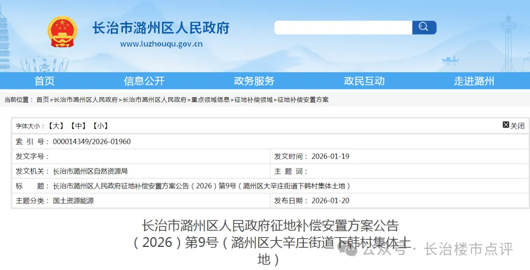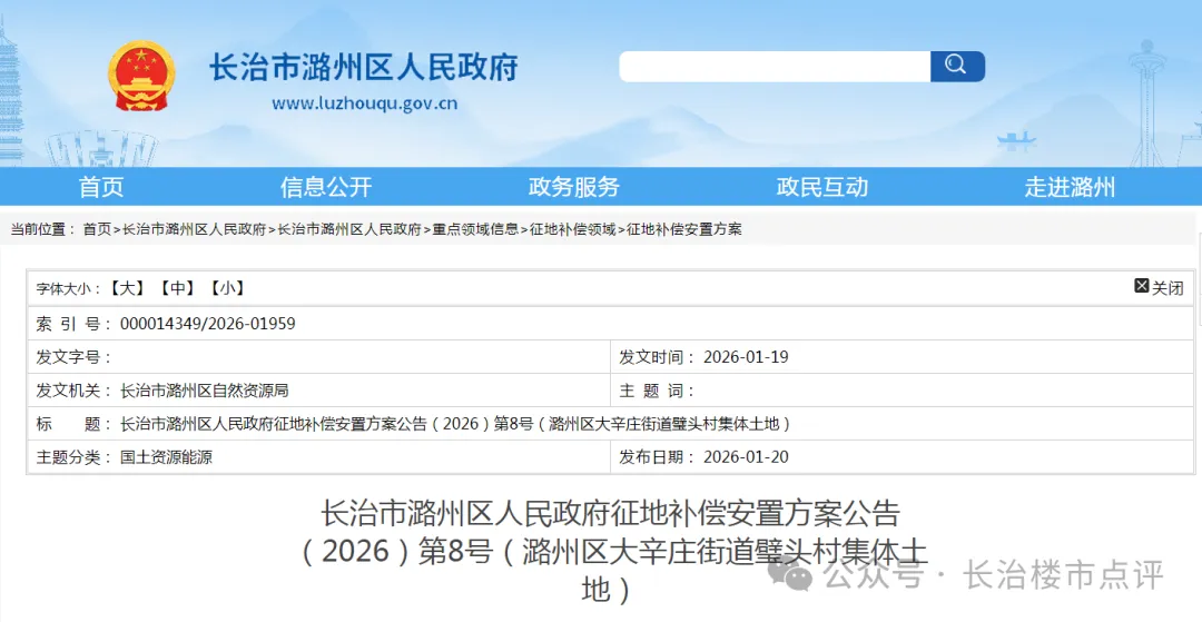 近日,长治市潞州区人民政府网站公示出多则土地安置补偿公告。以下为具体内容: