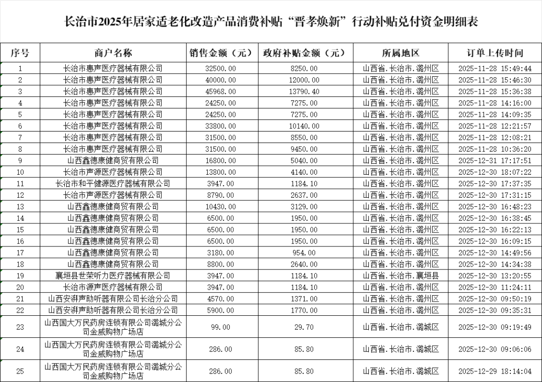 附件:长治市2025年居家适老化改造产品消费补贴“晋孝焕新”行动补贴资金兑付明细表