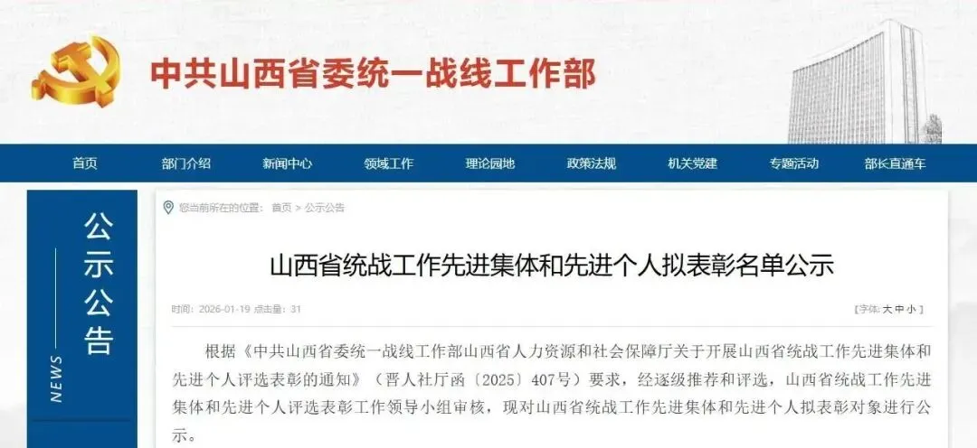 根据《中共山西省委统一战线工作部山西省人力资源和社会保障厅关于开展山西省统战工作先进集体和先进个人评选表彰的通知》(晋人社厅函〔2025〕407号)要求,经逐级推荐和评选,山西省统战工作先进集体和先进个人评选表彰工作领导小组审核,现对山西省统战工作先进集体和先进个人拟表彰对象进行公示。