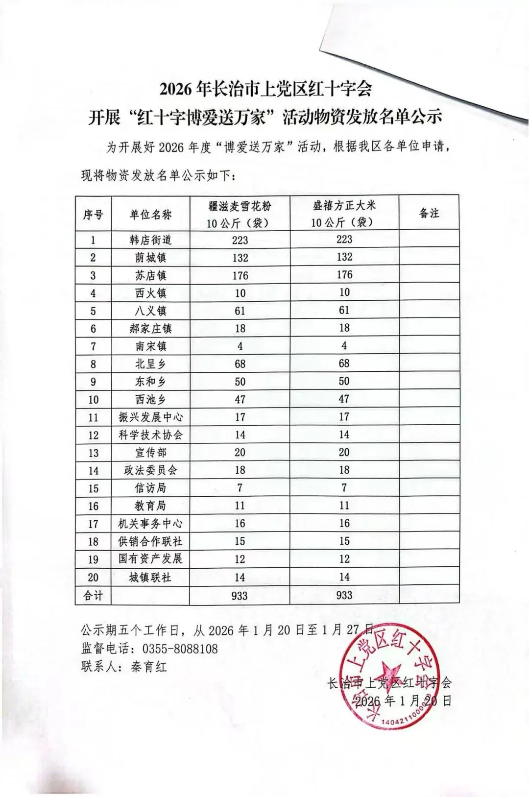 2026年长治市上党区红十字会开展"红十字博爱送万家"活动物资发放名单公示