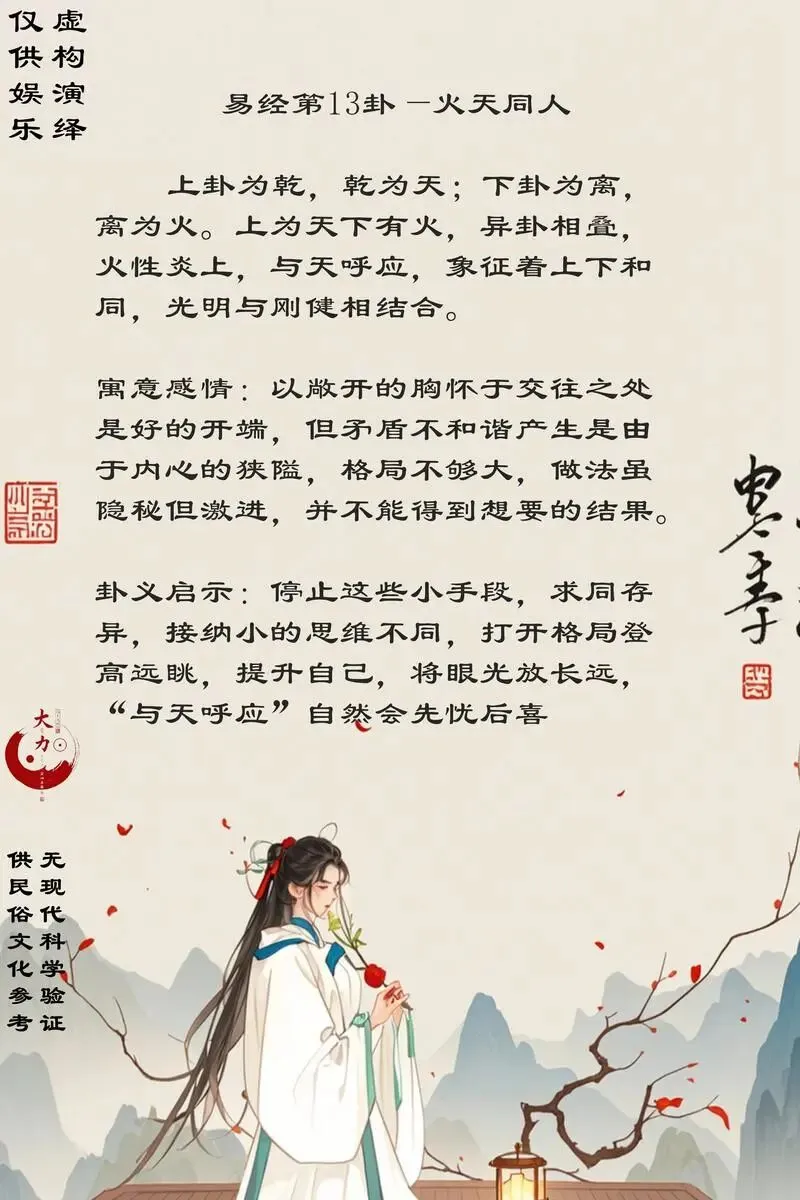 它描绘的,不是野火燎原的混乱,而是文明之火在朗朗乾坤下的有序燃烧。如同太阳高悬于天,其光辉平等地普照万物,不因山川高低、草木荣枯而有所偏私。这正揭示了“同人”的第一层核心:在公正、光明的天道法则(乾)之下,实现人与人之间的文明聚合(离)。