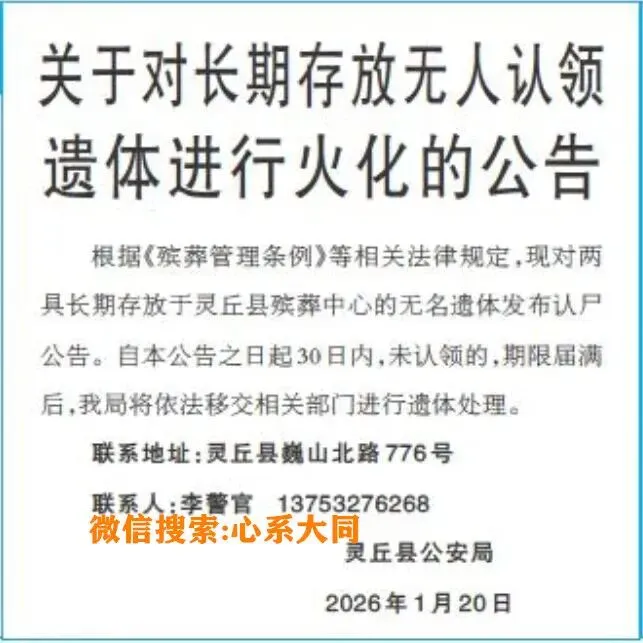 >大同:事关两具无名遗体 认尸公告
